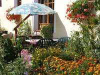 Der Mittelpunkt dieser ansprechenden Ferienwohnung ist der gemütliche Wohnraum, mit der Terrasse in unseren Bauerngarten.