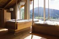 Fühlen Sie sich geborgen wie ein Vogel im Nest. Mit der Freiheit zu jeder Zeit Abenteuer zu erleben und flexibel Ihre Tage zu gestalten. Ihr gemütliches Urlaubszuhause ist die Ferienwohnung mit Sichtdachstuhl aus Lärchenholz, einem Wohnraum mit ausziehbarer Schlafcouch, Schlafzimmer mit King-Siize-Bett, separatem Kindernest mit 2 Einzelbetten, gemütlicher Sitzecke, Küche - komplett ausgestattet mit Geschirr & Wasserkocher, Sat-TV, Telefon, DU/WC, Panoramafenster und Balkon.FeWo Bachstelze