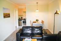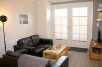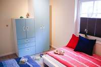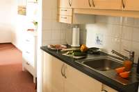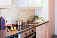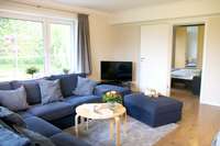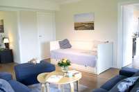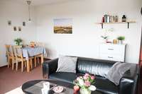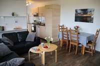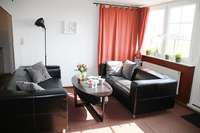 Diese Wohnung liegt im Erdgeschoß und bietet eine große Küche mit einem Esstisch. Im Wohnzimmer befindet sich neben einer großen Sofaecke, Fernseher etc. ein ausziehbares Doppelbett mit normalen Lattenrosten und Matratzen als zusätzliches Doppelbett (160 cm x 200 cm).