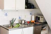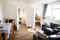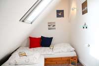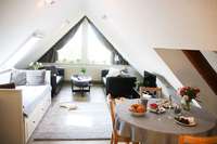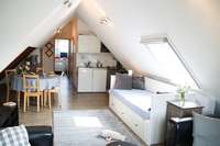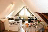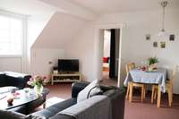 Diese Ferienwohnung liegt im Dachgeschoß. Über eine flache Außentreppe gelangen Sie auf die ca. 60 qm große Dachterrasse. Dort stehen ein Strandkorb und eine Sitzecke für Sie bereit. Gleich hinter Ihrer Haustür können Sie am Treppenfuß die Schuhe abstellen und die Innentreppe in das Dachgeschoß nehmen. Die Wohnung verfügt über ein Schlafzimmer mit zwei Betten (90 x 190 cm und 100 x 200 cm), ein kleines Duschbad und einen großen Wohnraum mit Küchenzeile, Esstisch, Fernseher und 2 Sofas. Das ausziehbaren Doppelbett (2 Matratzen von 80 x 200 cm) bietet die Möglichkeit einer Aufbettung.