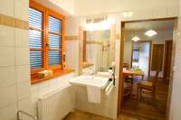 In der Wohnung sind alle Türen 90cm breit, Umgebung und Eingangsbereich sind eben und komplett zufahrbar, großzügiges Badezimmer ohne Schwellen mit Sitz in der Dusche, unterfahrbarem Waschtisch, WC von links befahrbar. Bei Einzelpersonen ist das Küchengeschirr max. 1 m über Boden, der Tisch im Wohnraum ist unterfahrbar, je ein Rollstuhlfahrer in beiden Schlafzimmern möglich.