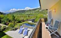 Unsere neue Ferienwohnung im 2. Stock trägt den Namen „Bergblick“. Auf drei Balkonen können Sie den herrlichen Ausblick auf unsere Berge und unsere Talsohle genießen.
