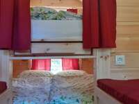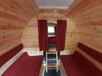 Hinterer Teil des XXL-Fasses: 2 übereinander liegende Schlafräume (2x2m und 2x1, 60m), davor kleiner Aufenthaltsraum mit ausziehbaren Tisch und 2 Bänke-beheizbar.