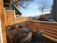 Diese Ferienwohnung liegt ebenerdig direkt neben dem Café. Vor dem Gebäude hat sie eine eigene kleine Terrasse mit Aussicht bis zum Spielplatz!