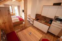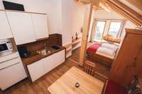 Die geräumige Einraumwohnung bringt Sie mit einer wunschlos ausgestatteten Küche, einem gemütlichen Wohn- und Schlafbereich sowie einem modernen Bad mit WC & Dusche, entspannt durch den Urlaub. Apartment Hochstadel-Blick