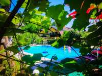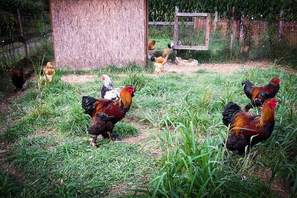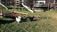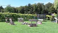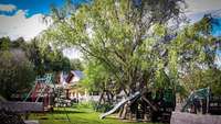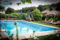 Im Freien gibt's einen schönen Kinderspielplatz, einen Swimming-Pool und natürlich unsere Tiere zum Streicheln.
