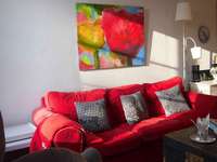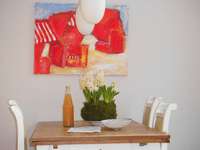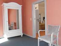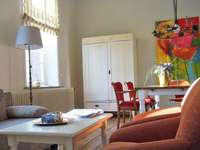 An der prächtigen Treppe des alten Herrenhauses vorbei gelangen sie in die Strandgutwohnung. Ins Auge fällt gleich das rote Sofa und sorgt für gute Laune. Helle Möbel mit einigen wenigen Farbtupfern. Durch die großen Fenster haben sie einen besonderen Blick auf die schöne Lindenallee oder in die alte Rotbuche. Hier können sich eins bis vier Personen wunderbar tummeln.