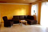 An das Wohnzimmer schließt außerdem unsere große Rosenterrasse an, auf der man gemütlich beisammen sitzen und entspannen kann.