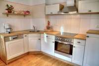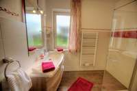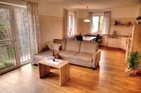 Auch diese Wohnung ist ebenerdig erreichbar. Mit ca. 55 qm ist sie etwas kompakter geschnitten, lässt aber in Punkto Ausstattung keinerlei Wünsche offen. Auf der Südterrasse hat man einen guten Blick auf Hof und Garten.