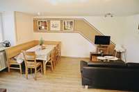 Unsere Maisonette-Ferienwohnung „Im Obstgärtle“ ist etwa 55 m² groß und erstreckt sich über das Ober- und Dachgeschoss. Im unteren Stockwerk befindet sich ein gemütlicher Wohn-, Essbereich mit Küchenzeile. Im oberen offenen Stockwerk liegt das Schlafzimmer – extra auch für „Große“ mit einer Bettenlänge von 2,20 m – sowie das Badezimmer mit begehbarer Dusche
