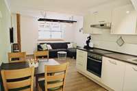 - Einbauküche mit Ceranfeld und Backofen, Spülmaschine, Kühlschrank mit separatem Gefrierfach, Padmaschine zum Kaffee kochen, Wasserkocher, Geschirrtücher, Spültuch, Verbrauchsmaterialien (Spülmittel, Spülmaschinentabs)