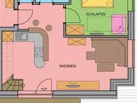 - Wohnküche mit Mikrowelle, E-Herd, Geschirrspüler, Kaffeemaschine, Wasser- und Eierkocher