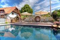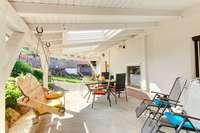 Beim separaten überdachten Eingang mit Terrasse hast Du Deinen eigenen Grill, dazu unmittelbaren Zugang und direkten Blick auf den Spielplatz, den großen Garten sowie unserem Pool.