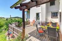 Zum separaten Eingang gehört ein großer möblierter und überdachter Freisitz mit Grill, von hier hast du Spielplatz und Hof im Blick - und eine herrliche Aussicht man glaubt es kaum bis zu Vogesen.