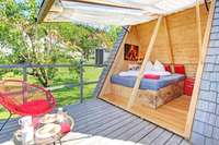 Außerdem nur für Dich und Deine Familie: eine großzügige möblierte Holzterrasse mit Grill, die direkt an den großen Garten mit Spielplatz grenzt.Ferienwohnung Margaritte