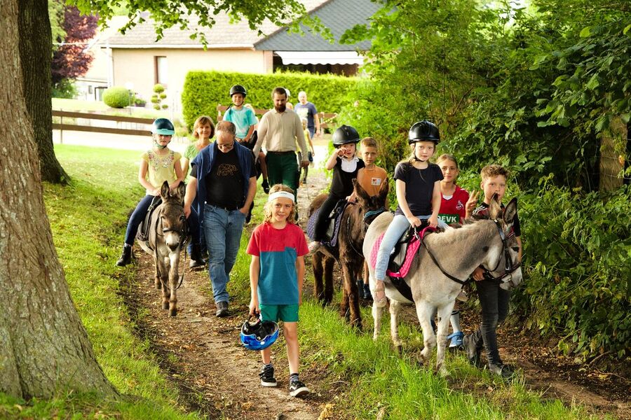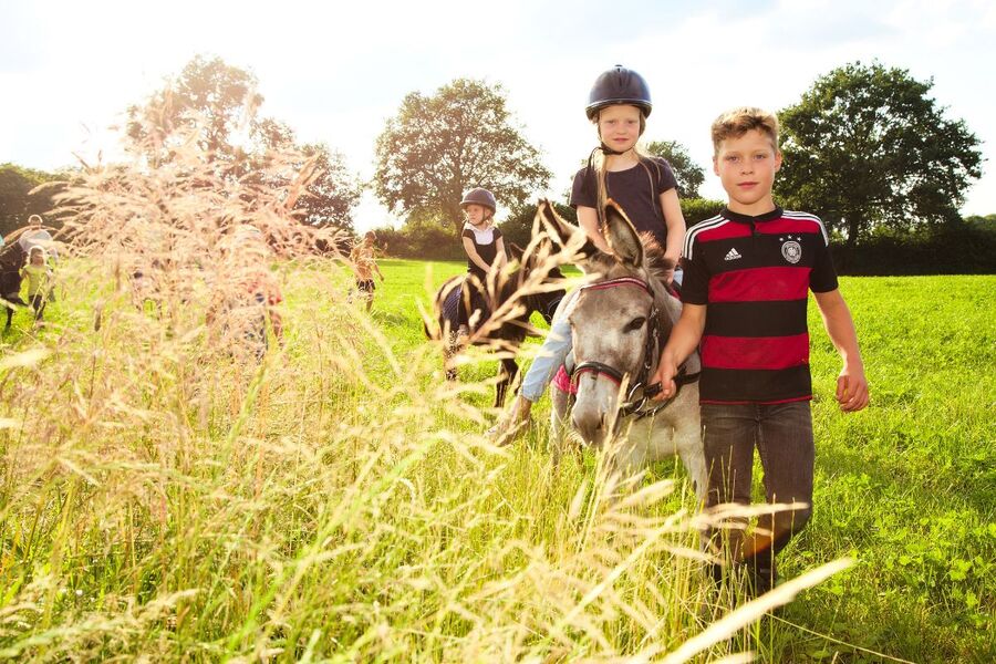 Bettwäsche und Handtücher • Kinderbett, Bettgitter und Hochstuhl • ein großer Sandhaufen mit vielen Spielgeräten (Trettrecker, Bobby-car usw.) • Eselreiten für die Kinder • ein großer Garten mit Kinderspielgeräten (Schaukel, Trampolin usw.) • Gemütliche Sitzecken mit Strandkörben