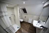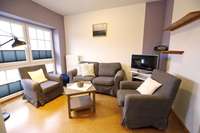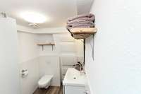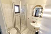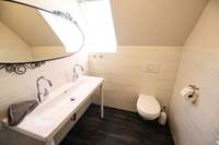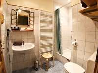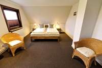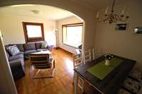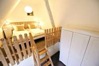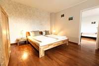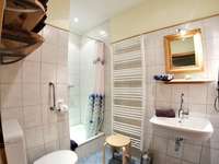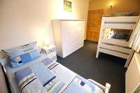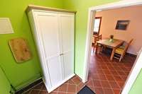 Die Wohnung "Gartenblick" liegt im Nachbarhaus unseres Bauernhauses, direkt auf unserem Hof. Sie ist 80 m² groß und verfügt über zwei Etagen. In der unteren Etage befinden sich das Bad mit Dusche und WC, eine Küche und das Wohnzimmer mit Essbereich. In der oberen Etage sind ein Kinderzimmer (ein Etagenbett und zwei Einzelbetten), das Elternschlafzimmer mit einem herrlichen Fernblick und ein weiteres kleines WC mit Waschtisch.