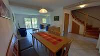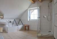 Die zwei 4 Zimmer Maisonette Ferienwohnungen "Reneklode" und "Kastanie" befinden sich im Haupthaus und sind jeweils 90 m2 groß. Auf der ersten Etage im OG ist ein großes Wohnzimmer mit Essplatz für eine große Familie sowie die Küche und ein WC. Im DG sind 3 Schlafzimmer (Familienzimmer mit Doppelbett, Einzelbett und Kinderbett, 2 Bettzimmer und 1 Bettzimmer) sowie ein Bad mit Dusche, Badewanne und WC.