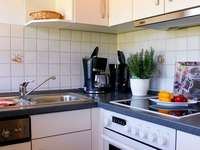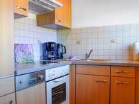 • Küche mit Herd (Ceranfeld), Backofen, Spüle, Kühlschrank, Kaffemaschine, Wasserkocher, Toaster, Handrührgerät