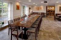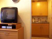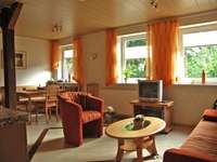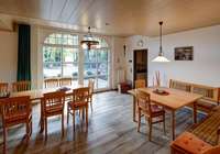 Der direkt am FeWo - Flur angrenzende Aufenthaltsraum (mit Terrasse) ist gerade für Gruppenbuchungen der ideale Platz zum gemeinsamen Verweilen. Hier steht ihnen eine eigene Küche zur Verfügung. Unseren Kühlraum können sie gerne für mitgebrachte Speisen und Getränke mit nutzen. TV-Sat ist auch dort.