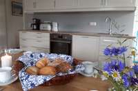 Von dem neugestalteten Wohn- und Essbereich mit offener Küche haben Sie einen traumhaften Weitblick über die Wiesenlandschaft Richtung Ostsee, die direkt hinter unserem Haus beginnt. Pferden unter blauem Himmel beim Grasen zuschauen — ein sehr entspannender Anblick!