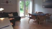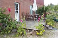 Zu dieser Wohnung gehört eine großzügige Terasse am Rande des schönen Apfelgartens, die mit einem Strandkorb und Gartenmöbeln ausgestattet ist, auf der von morgens bis abends die Sonne scheint. Ein schöner Platz für gemütliche Grillabende.Ferienwohnung Hofblick bis 4 Personen