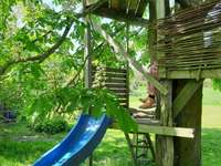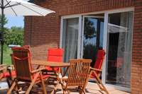 Auf der Terrasse unserer ebenerdigen Ferienwohnung Apfelgarten können Sie gemütlich und in Ruhe frühstücken und dabei die Kleinen im Blick behalten, die schon mitten im Spiel sind.